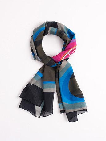 將花窗明月的意境映然與水波游動當中,展現蘇式庭院的意象之美。水墨質感中點綴藍色的水波與花窗明月,悠然愜意,將一幅蘇式美景印于絲巾之上。